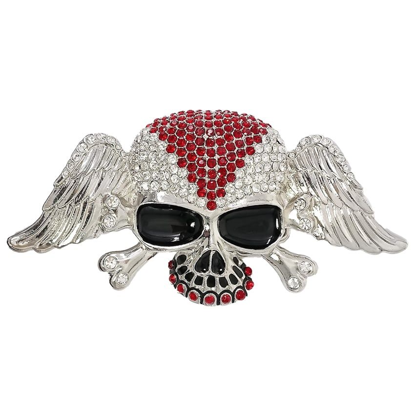 Add to WishlistUnlock your style potential and make a lasting impression with the Red Rhinestone Skull Belt Buckle. This buckle features an eye-catching design with a silver skull embellished with red rhinestones, adorned with wings on both sides and donning sleek black sunglasses.