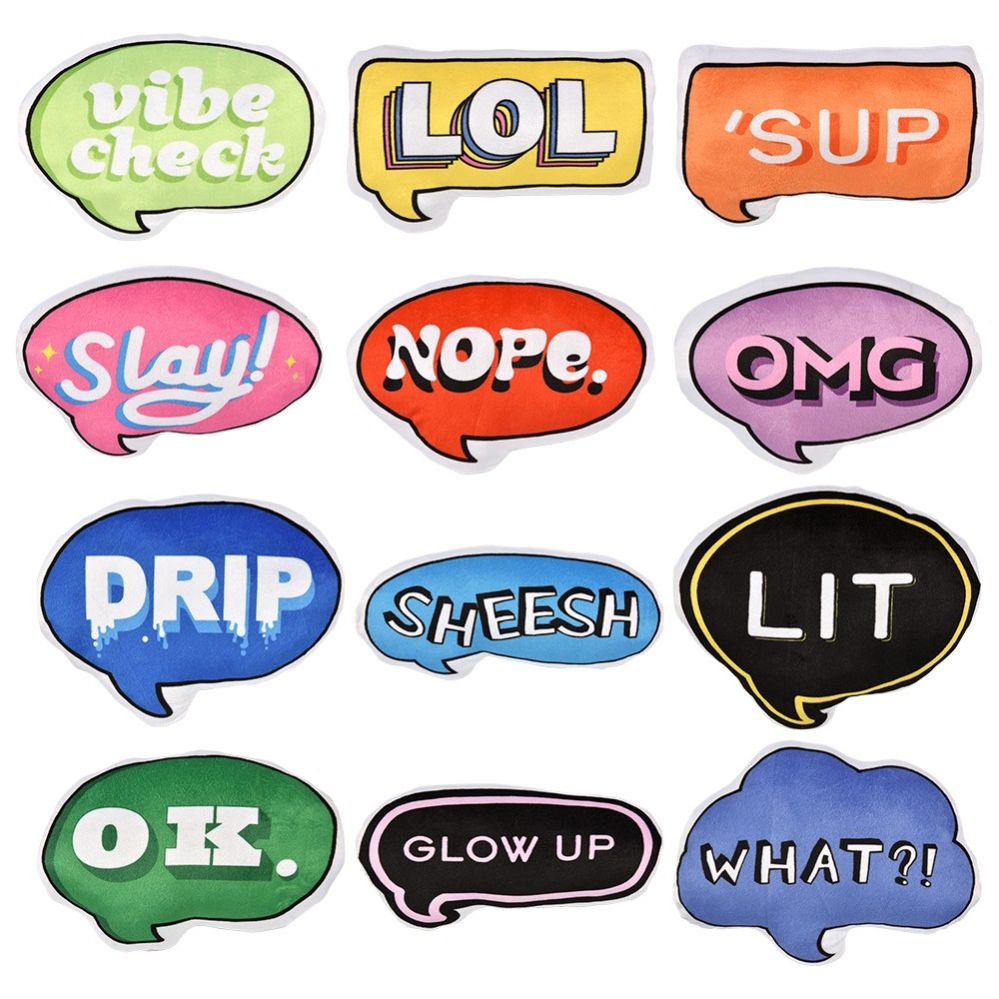 Phrases include: vibe check, LOL, 'Sup, OK., Slay!, OMG, sheesh, drip, lit, glow up, What !, OK.