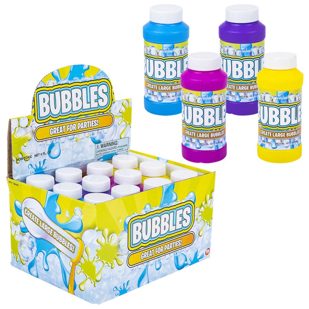4oz bubble bottleVariety of colorsPrinted “fun bubbles" labelGreat for party favorsPerfect small game prizeSold by the display12 pieces display