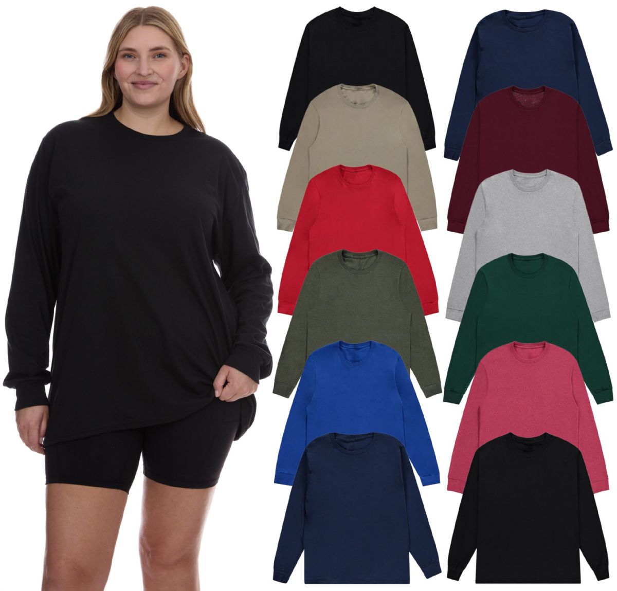 24 Pieces of Womens Plus Size Cotton Long Sleeve Oversized T-Shirts, Casual Fit Tops, Dark Assorted Size Large