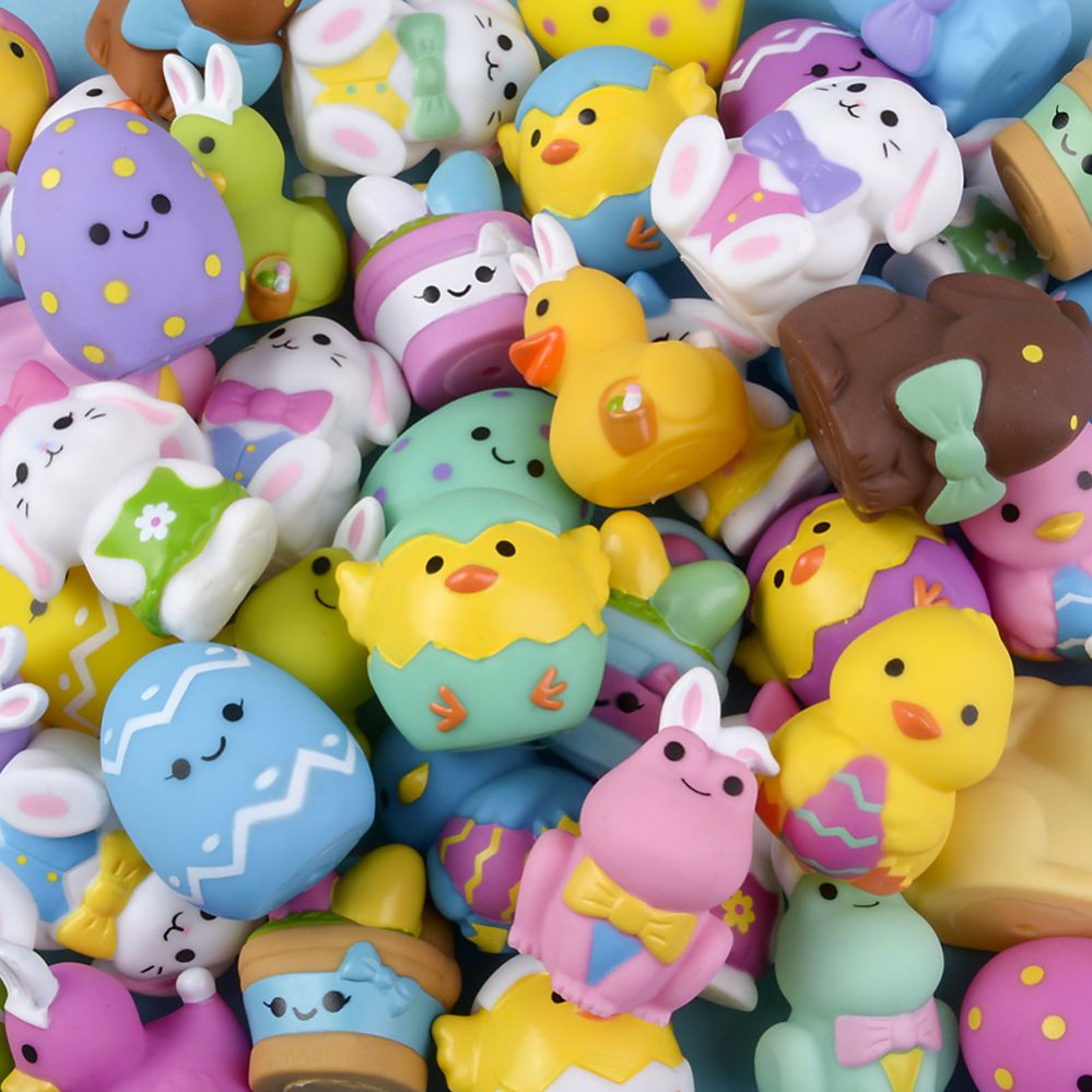 Mini rubber Easter characters with assorted designs Great for holiday baskets Great small crane prize options Assorted styles 50 pieces sold in a poly bag