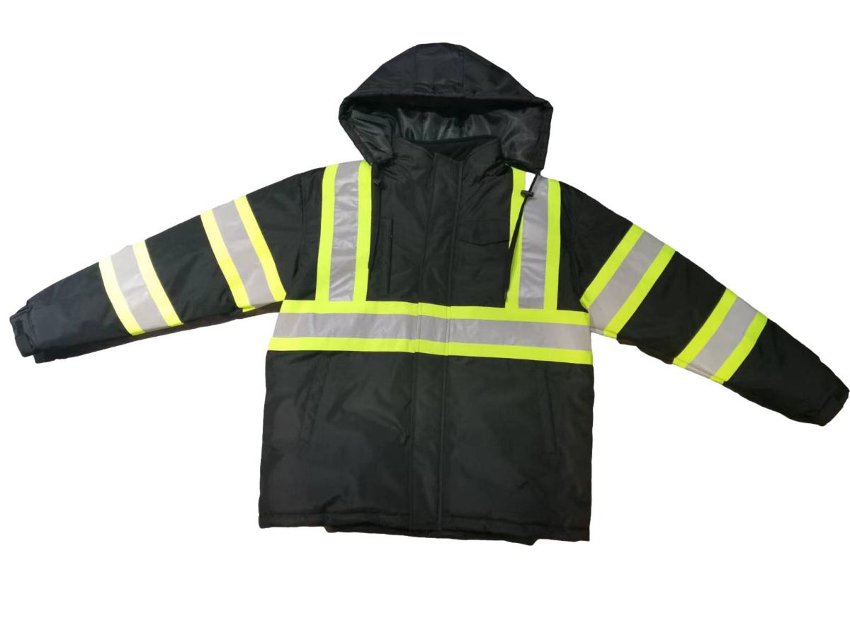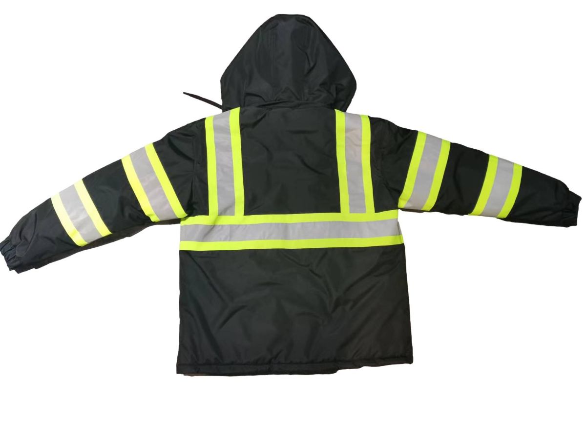 Features: High-visibility reflective strips, multiple pockets, adjustable hood