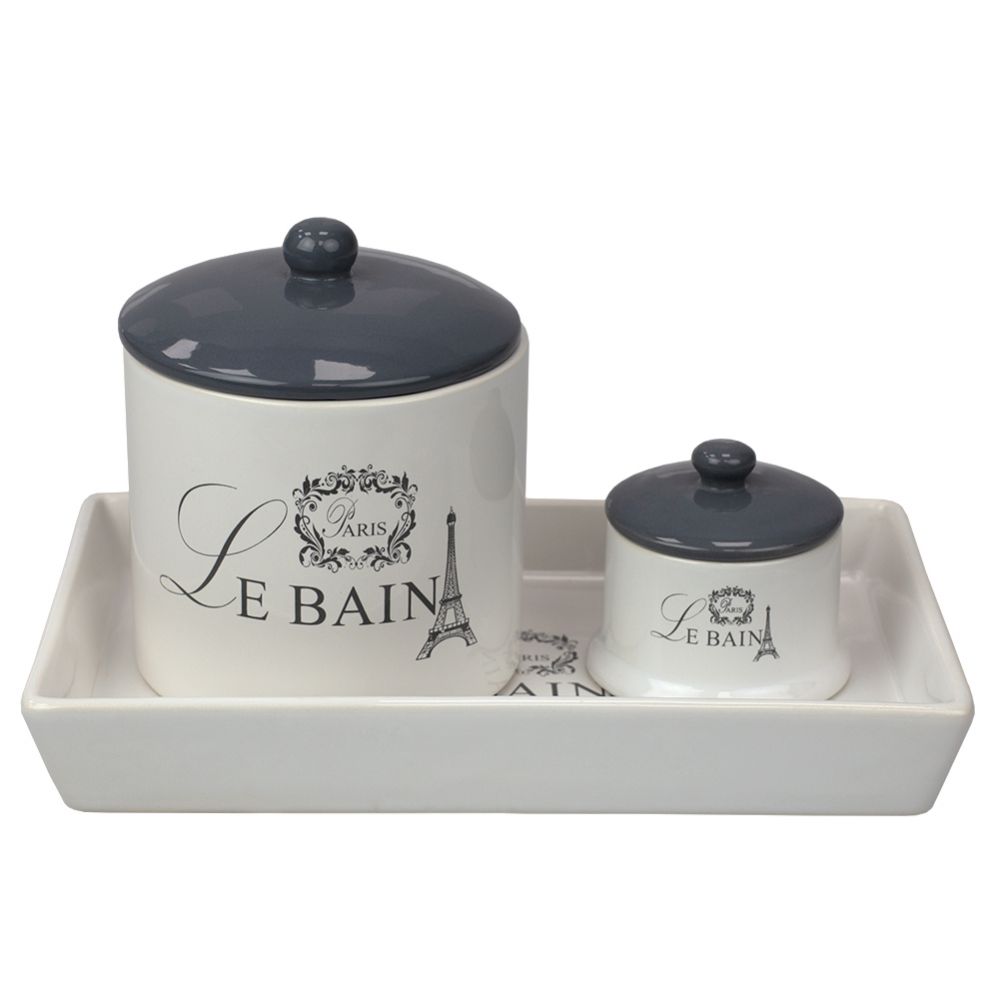 Add to WishlistRefresh your bathroom with a touch of Old World Parisian charm using this set of canisters with coordinating vanity tray. This handy canisters are great at keeping cosmetics, cosmetic pads, jewelry and other small toiletries and bath accessories neatly organized. Place on top of the vanity in the bathroom or dress up your bedroom dresser. It comes complete with a vanity to keep everything in place. Spot clean. For easy maintenance, simply gently wash the set with mild soap and water.