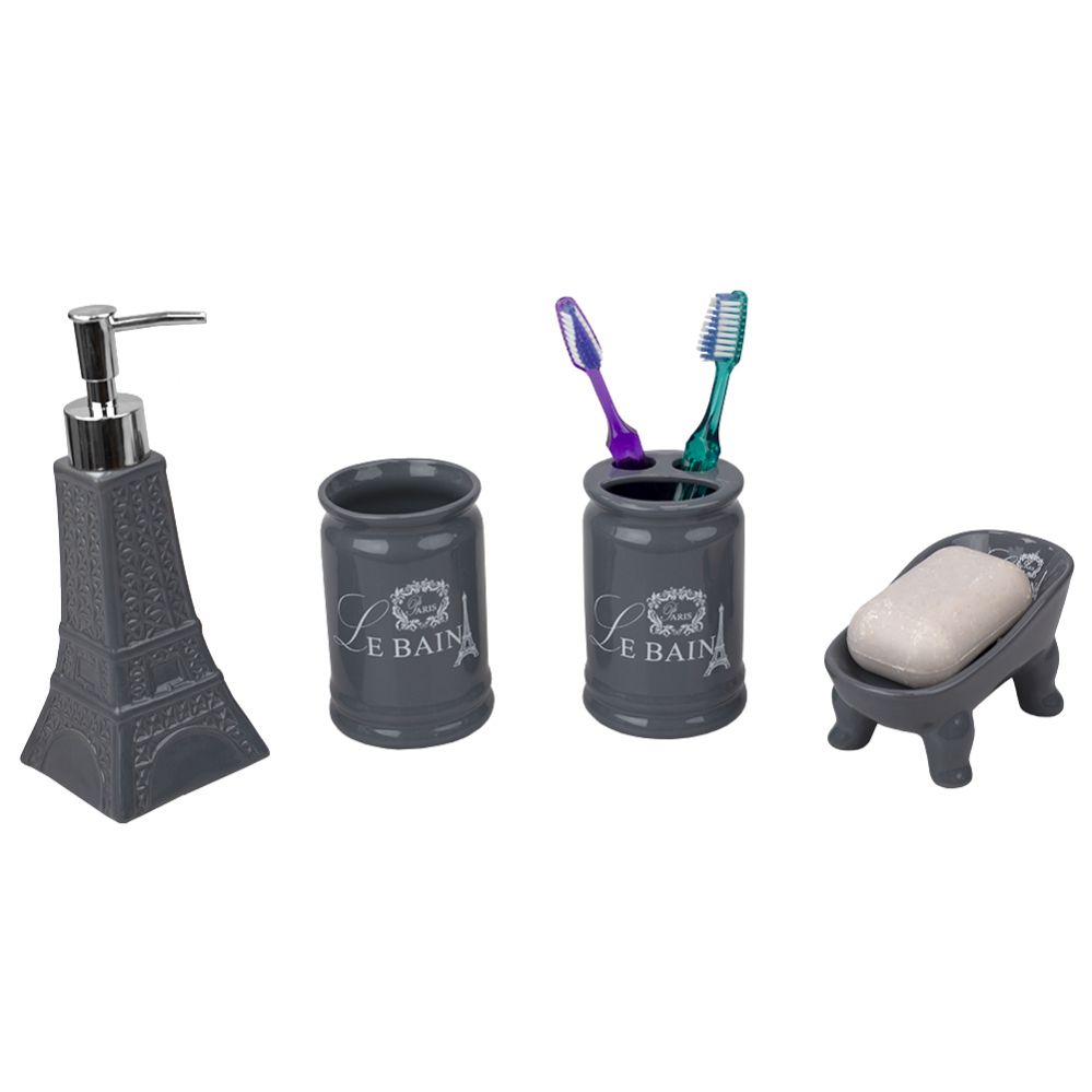 Add to WishlistTransform your bathroom into a chic Parisian retreat with the Paris Eiffel Tower 4 Piece Ceramic Bath Accessory Set. This elegant set includes a soap dish shaped like a clawfoot bathtub, an Eiffel Tower-shaped dispenser, a versatile tumbler, and a toothbrush holder that can accommodate electric or manual toothbrushes, toothpaste, and razors. The striking white graphic print theme creates a beautiful contrast against the grey ceramic, adding a touch of Parisian charm to your decor. Made from durable ceramic, each piece in this set is built to last, ensuring long-lasting beauty and functionality. The versatile design of the tumbler and toothbrush holder makes them perfect for storing various essentials, while the soap dish and dispenser add elegance and practicality to your daily routine.